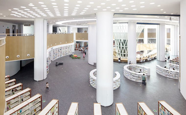 图书馆是学习的场所,因此图书馆照明要保证阅读、写字拥有足够的亮度。图书馆照明宜选择接近自然光效的光源,避免频闪和眩光,提高学习的舒适性和保护视力。图书馆主要分为阅览区和书库区。阅览室的书面照度要达到300-1500lx,宜选用T8或T5荧光灯光源,配置荧光灯格栅灯盘或者T5或T8荧光灯支架。从节能的角度,可以考虑选择T8 LED日光灯做光源,节能、环保、长寿,减少维护费用。书库照明中,视觉任务主要发生在垂直表面,书脊处的垂直照度宜为200lx。书库照明宜采用漫反射的格栅灯盘,对于珍贵的图书或文物书库,应选用有过滤紫外线的光源。
